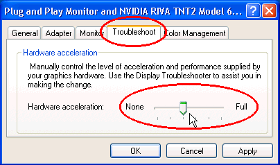 Click Start / Control Panel / System / Performance / Graphics, and slide Hardware acceleration to None.